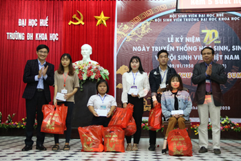 Sáng 9/1, Trường đại học (ĐH) Khoa học, ĐH Huế tổ chức lễ kỷ niệm 70 năm ngày truyền thống học sinh, sinh viên và Hội sinh viên Việt Nam (9/1/1950 – 9/1/2020) cùng chương trình “Tặng quà và hỗ trợ vé xe cho học sinh, sinh viên có hoàn cảnh khó khăn về quê đón Tết Canh Tý”.